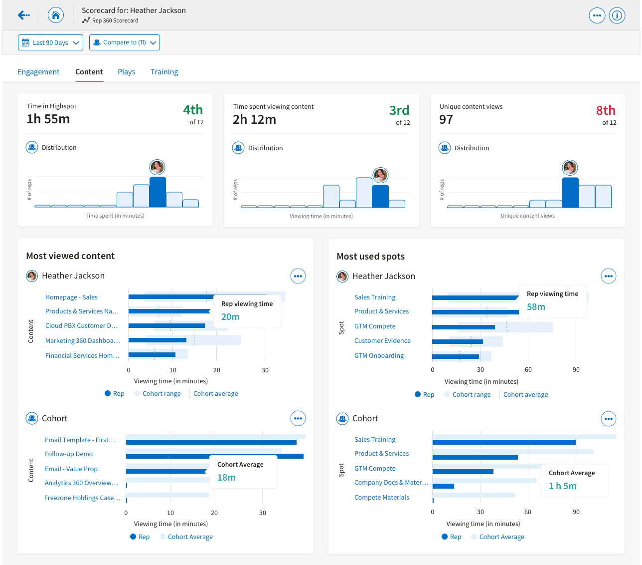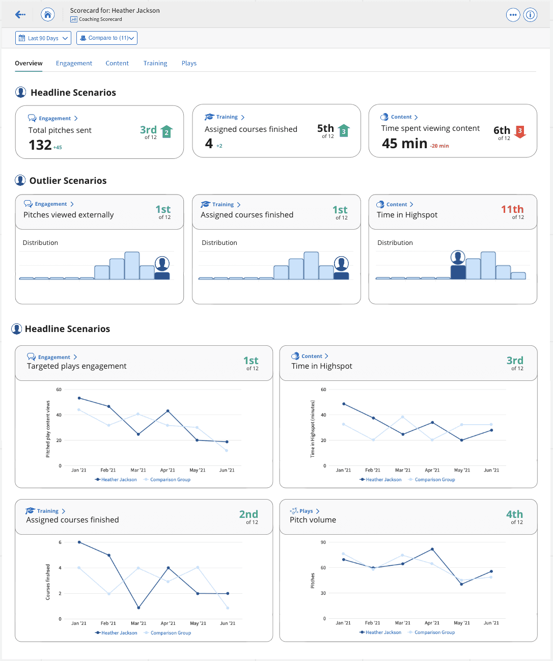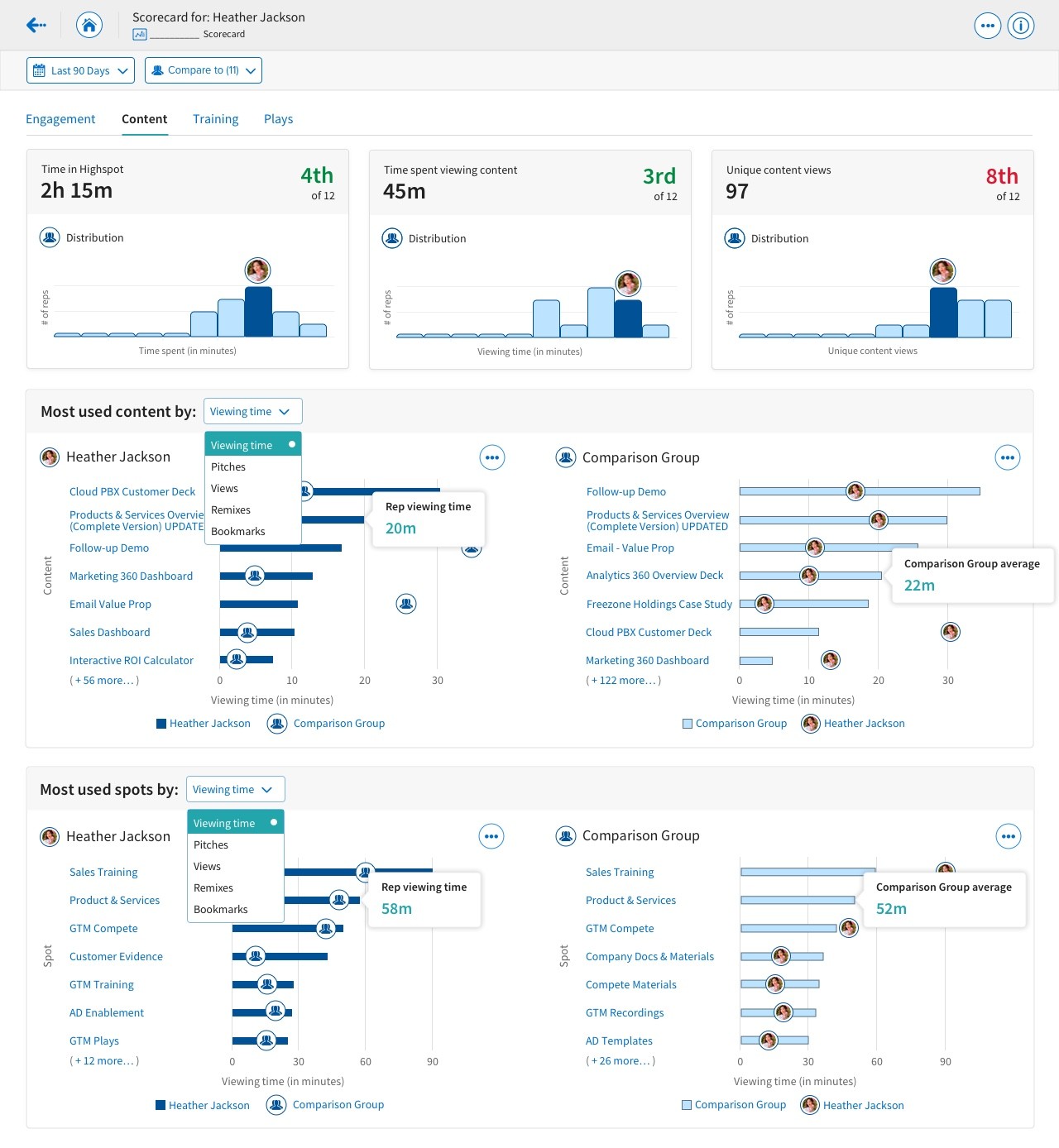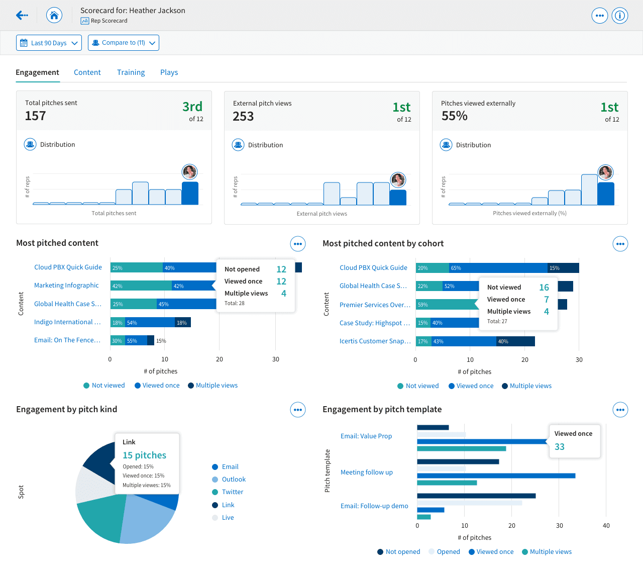 I created three additional scorecards. The Engagement Scorecard focused on how users were utilizing Highspot and how it was affecting their sales. The Play Scorecard enabled content creators to better understand how users were using the Plays they created with Highspot, and how they affected pitching. The Training Scorecard helped sales managers better determine how their sales reps were performing in comparison to their peers and top performers.