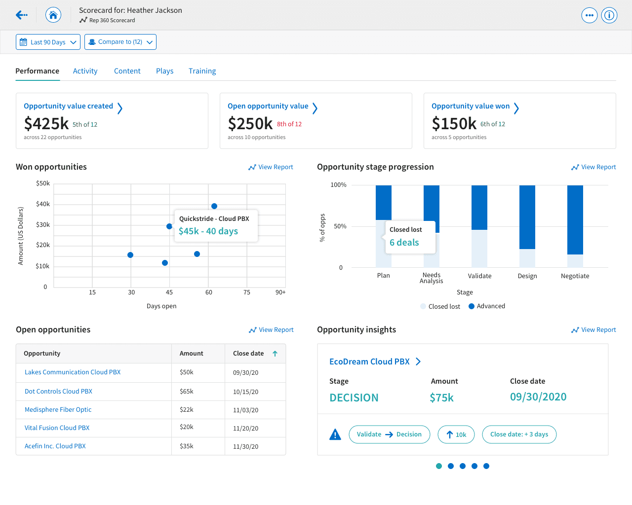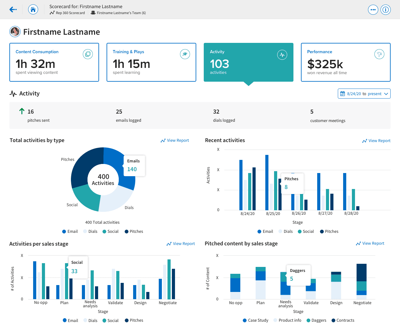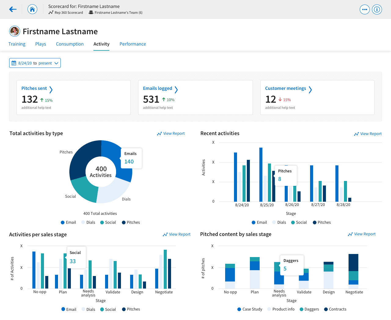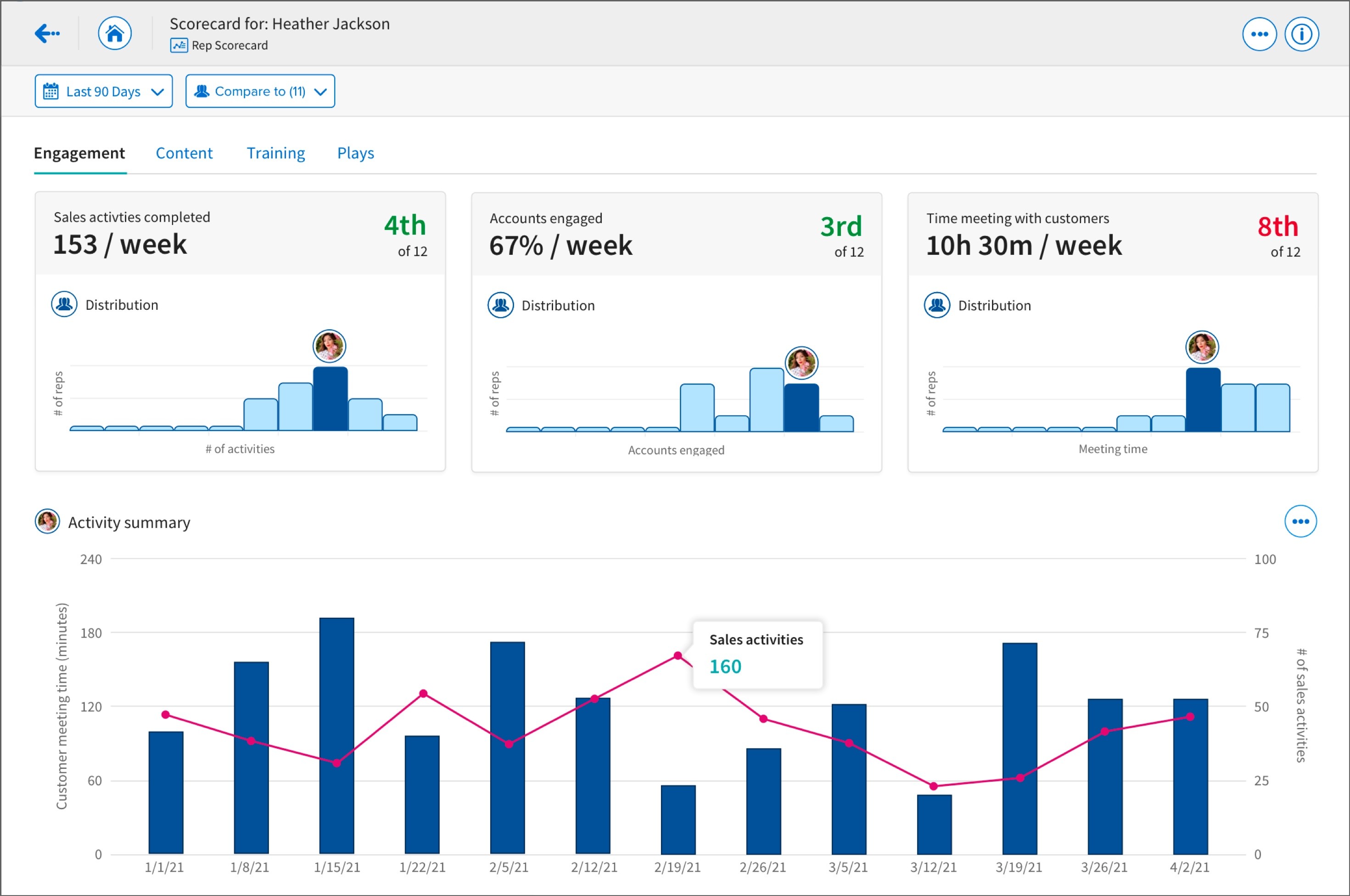I created three additional scorecards. The Engagement Scorecard focused on how users were utilizing Highspot and how it was affecting their sales. The Play Scorecard enabled content creators to better understand how users were using the Plays they created with Highspot, and how they affected pitching. The Training Scorecard helped sales managers better determine how their sales reps were performing in comparison to their peers and top performers.
